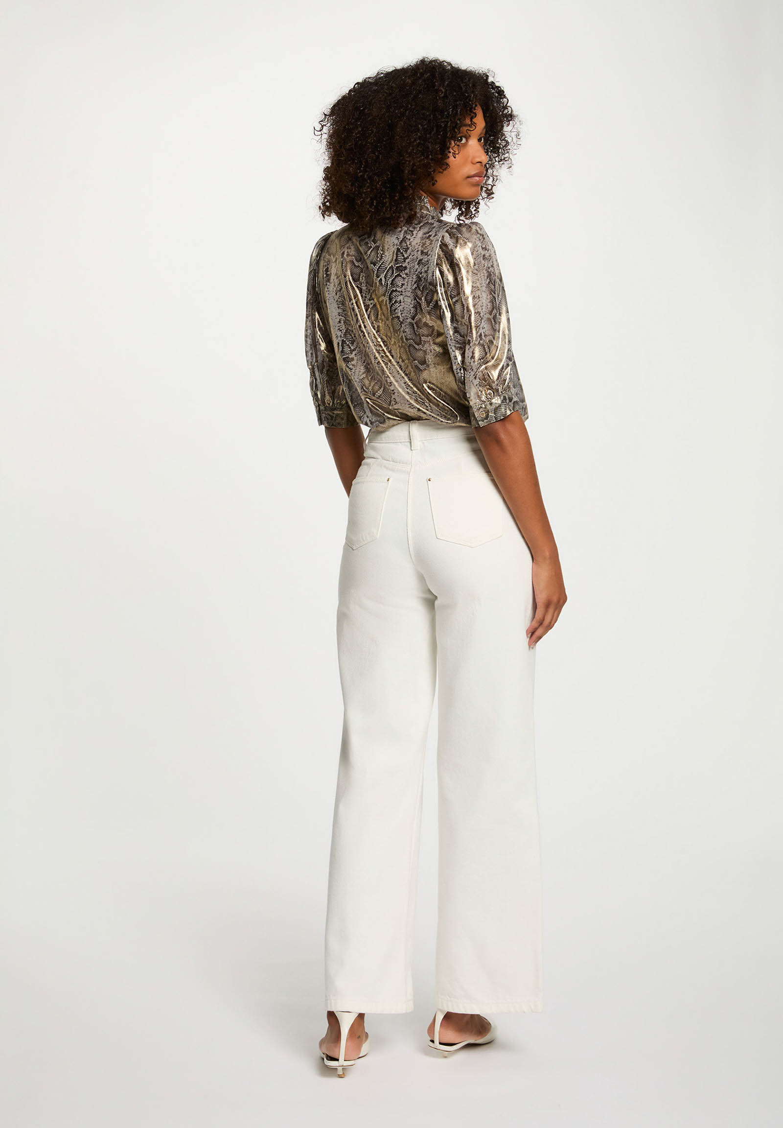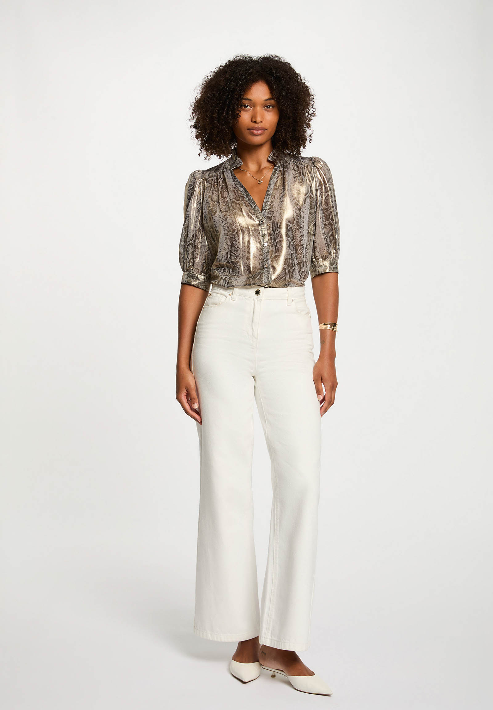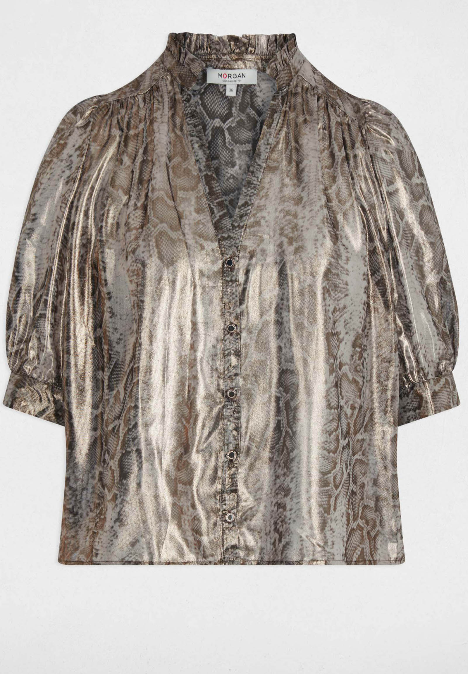 The Morgan de Toi python print shirt is a bold and refined piece, designed for the woman who loves to stand out with style. Made from a flowing fabric composed of 62% polyester and 38% recycled polyester, it combines elegance and a focus on sustainability.The design features a python effect animal print in neutral tones, a ruffled collar with a V-neck opening, and slightly puffed 3/4 sleeves, giving it femininity and character. Easy to pair with high-waisted trousers or skirts, it is perfect for both office looks and sophisticated evenings.A trendy piece by Morgan de Toi, expressing personality and modernity.