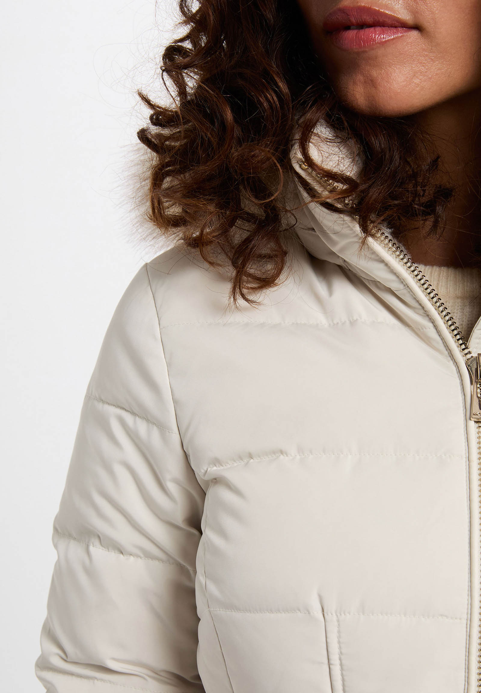 Realizzato in tessuto tecnico 100% poliestere, con fodera interna in poliestere e inserti in similpelle, è imbottito con 50% piumino danatra e 50% piuma, per garantire calore e leggerezza allo stesso tempo. Il cappuccio è rifinito con bordo in eco-pelliccia morbida, ideale per proteggere dal vento e dalle basse temperature.